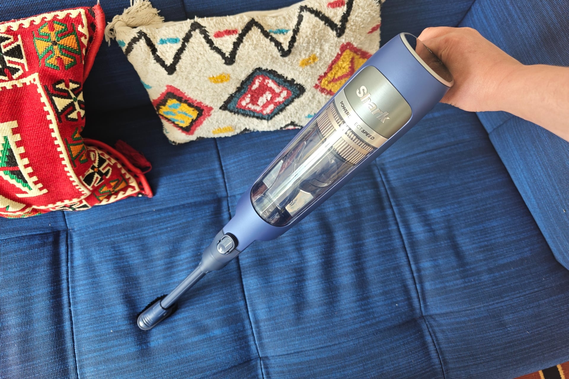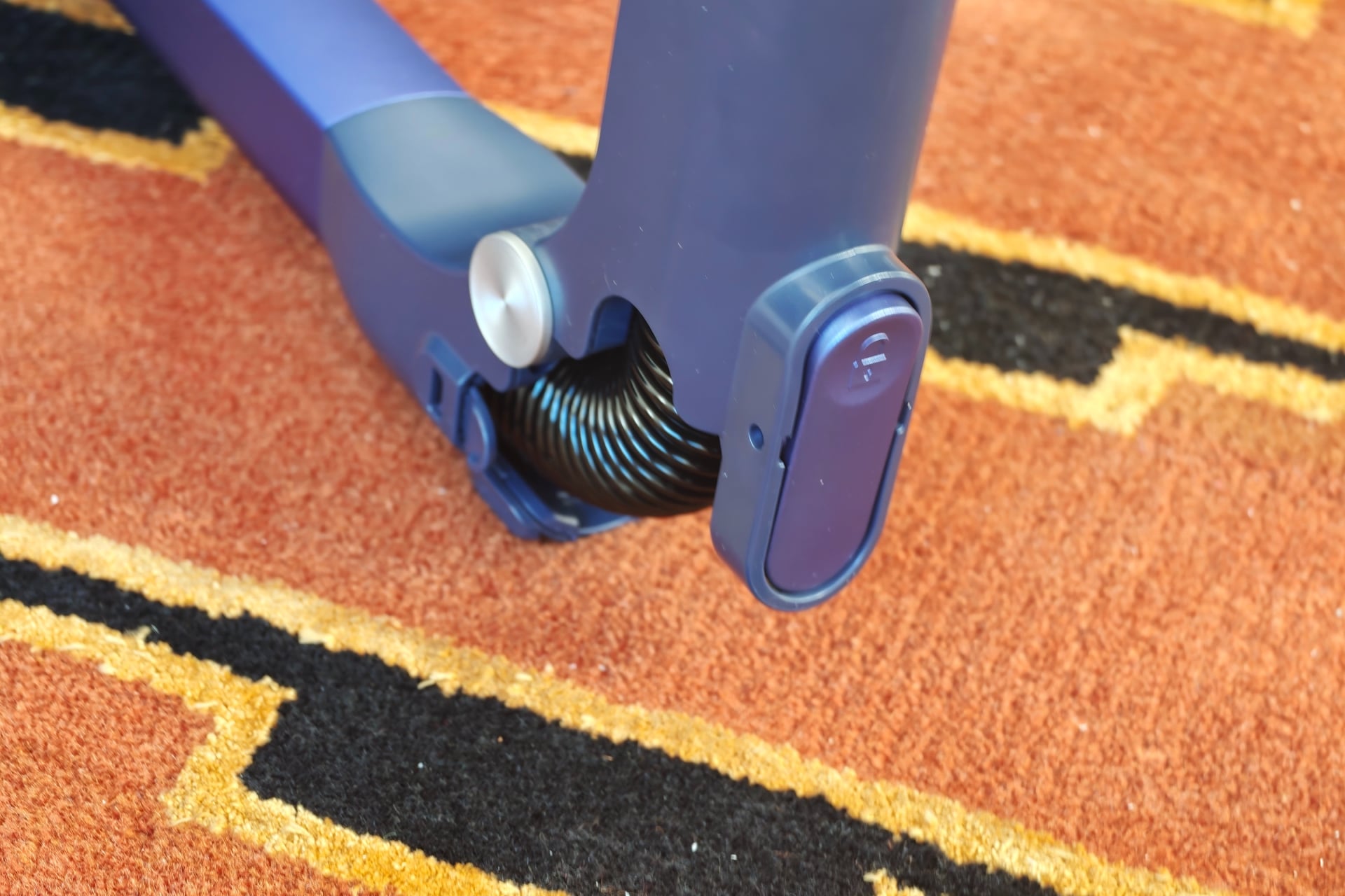 C’est sur la maniabilité que le dernier aspirateur balai sans fil de Shark tire également son épingle du jeu. Son manche se plie facilement d’une simple pression sur un bouton vers l’avant pour se glisser partout sans avoir à se baisser. C’est lui le contorsionniste, pas nous. Le système de charnière nous a semblé robuste, aucun cliquetis n’est à signaler lors des pliages. Et surtout, une fois plié, il est facile d’atteindre les recoins les plus difficiles sans avoir à le cogner partout.