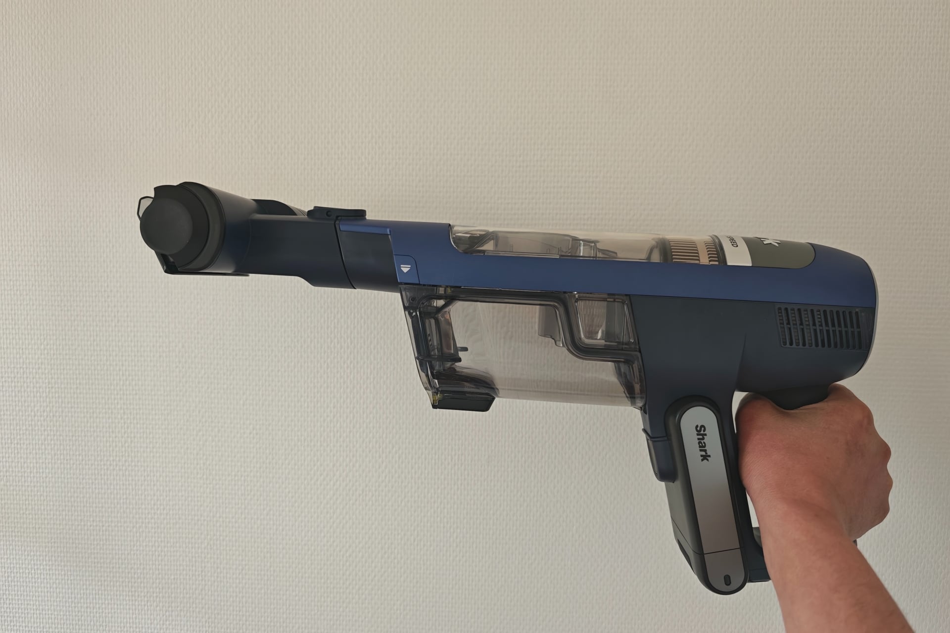 En matière d’esthétique, ce modèle ne fait pas déshonneur à la réputation de Shark. À l’instar de Dyson, la marque a toujours soigné l’allure de ses produits. Bien que tout en plastique, notre modèle de test en coloris bleu métallisé n’a pas défiguré notre salon de sa présence. Un bon point pour ceux qui veulent le garder dans la pièce à vivre, toujours prêt à intervenir dès qu’une gaffe arrive.