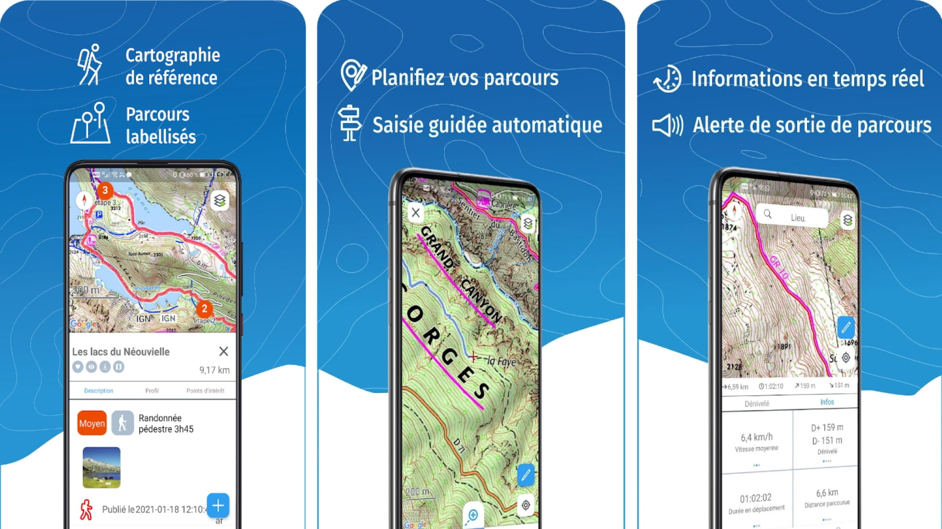 L’application permet de préparer vos itinéraires avant de partir : vous pouvez tracer un parcours à la main, charger un GPX existant, ou choisir parmi des circuits déjà prêts. Une fois sur le terrain, le GPS de votre smartphone vous suit en temps réel : vous voyez votre position, votre vitesse, le dénivelé accumulé, la distance parcourue et le temps estimé restant. Un système d’alertes vous prévient si vous sortez du chemin prévu, ce qui aide à éviter de s’égarer ou de prendre un mauvais embranchement.