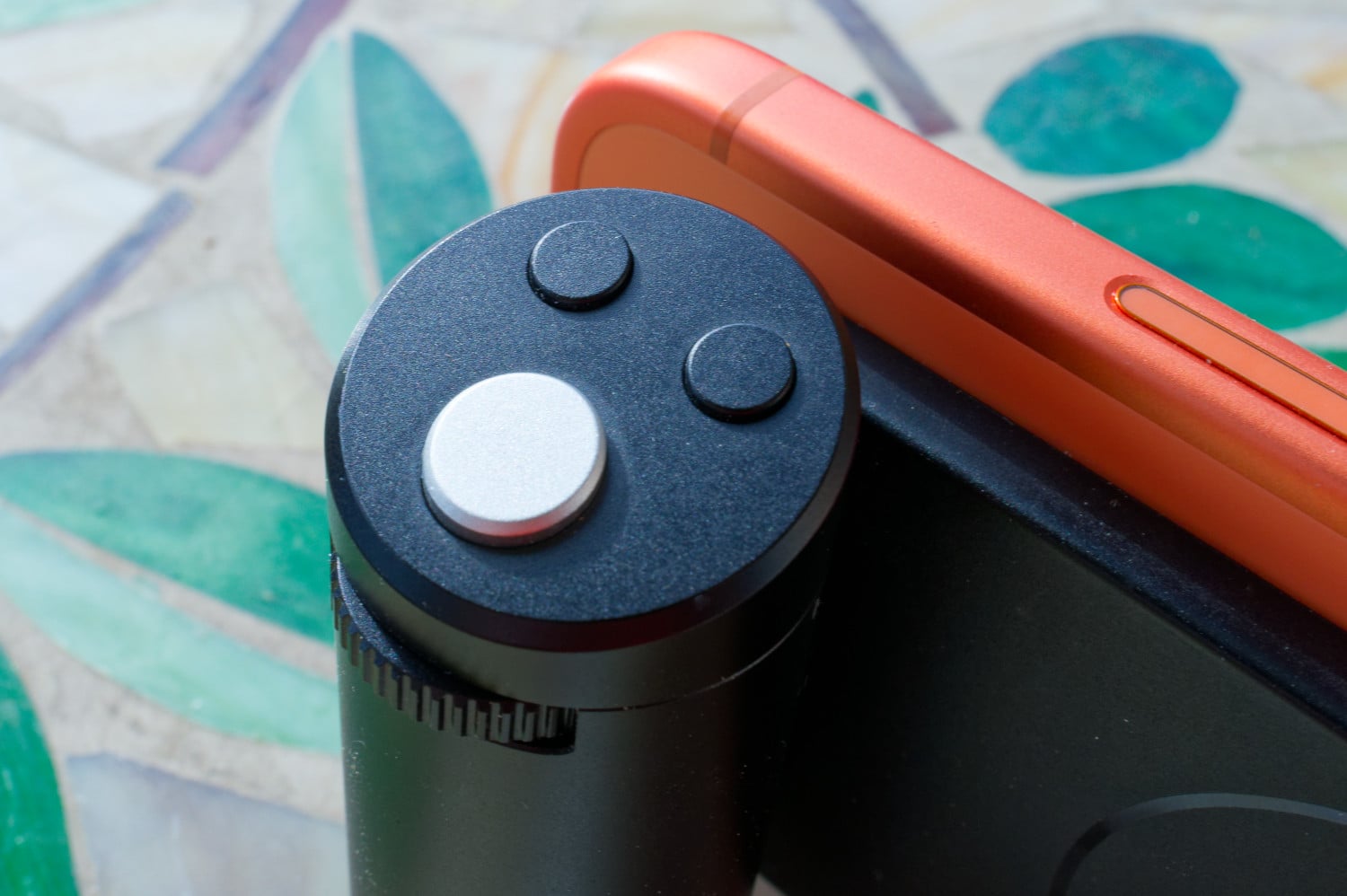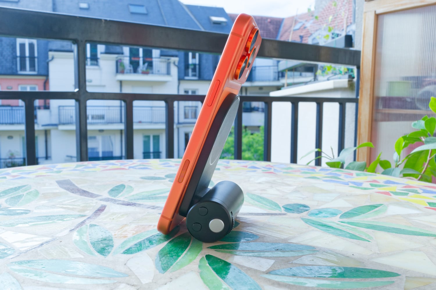 Autre bon point : le LUX Grip est ambidextre. Le module MagSafe peut être dévissé et pivoté de 180° pour passer en configuration gaucher. Un filetage 1/4 » logé à la base permet de la fixer sur un trépied, tandis que et la poignée posée à plat peut faire office de de mini-support pour maintenir l’iPhone debout en mode portrait. Plutôt pratique pour les appels vidéo.